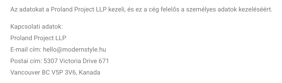 Az adatokat a Proland Project LLP kezeli, és ez a cég felelős a személyes adatok kezeléséért.
